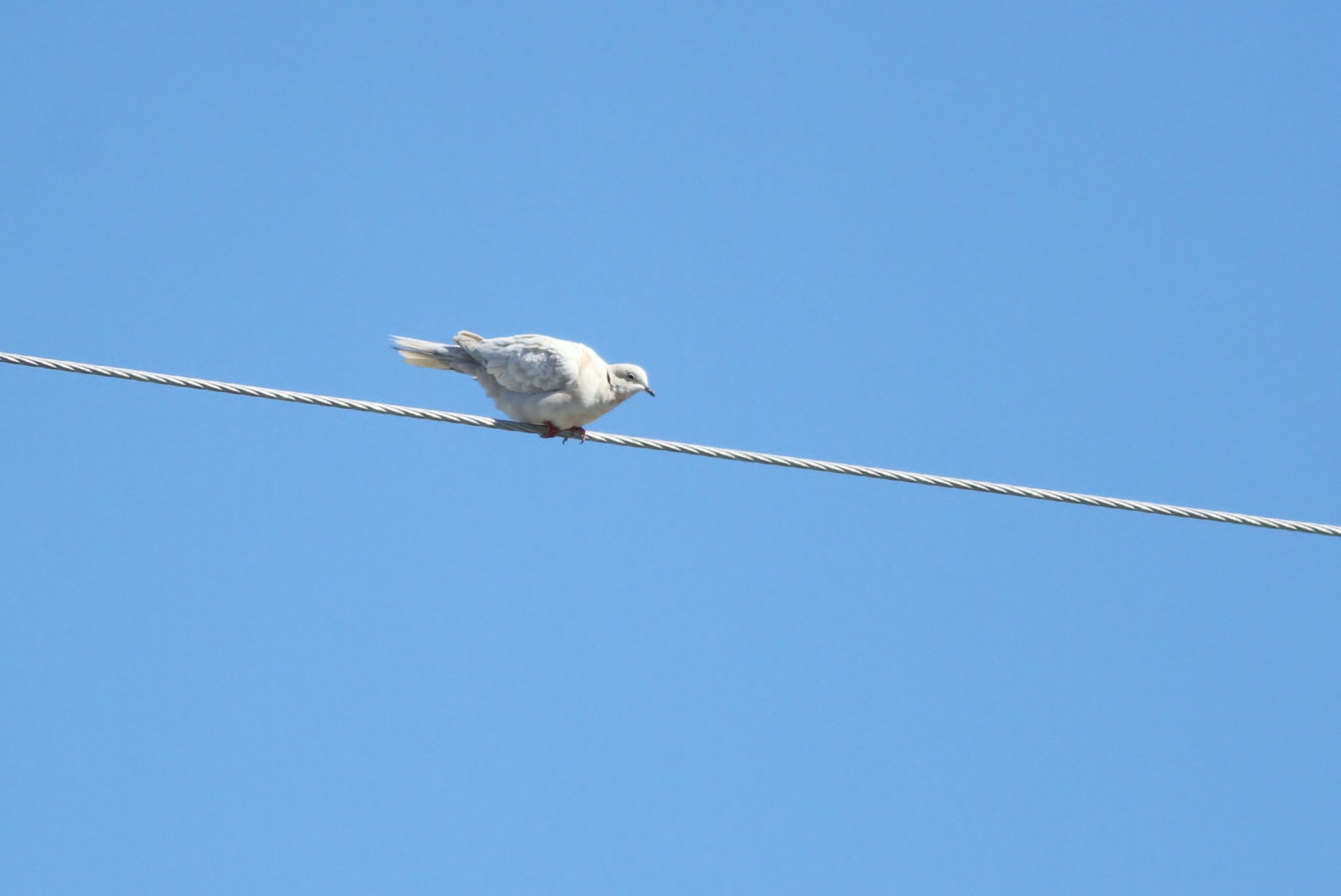 Out of the dozens of bird species introduced to the Americas, none has been so instantly successful or has spread so rapidly than the Eurasian Collared-Dove. These large doves were introduced to the Bahamas in the mid-1970’s, quickly spreading to Florida, and then their population exploded to the point where they have been recorded in every state, province, and country in North America and the Caribbean. They are now resident across most of this range (except the northeast, oddly) and some survey data, such as the Christmas Bird Count, indicates the population may grow by as much as 34% per year! If you’ve birded North America, you are undoubtedly familiar with this bird – and I wouldn’t be surprised if you can currently hearing one coo-ing outside your window. If you have spent time around collared-doves, you may have noticed that every once in awhile you’ll see a pale (often called leucistic by birders) or otherwise dilute-plumaged bird. These white or off-white doves readily stand out among the typical khaki-brown birds. The fact that 1-5% of Eurasian Collared-Doves show this pale plumage is very likely due to the Founder Effect where the introduction of a small number of doves created limited genetic variation in the booming population, and so odd and normally rare recessive traits become more regular. Below is a gallery of some pale Eurasian Collared-Doves I’ve come across in North America. Notice that most of these birds still do show some patchy darker ‘normal’-colored feathers scattered around and aren’t completely diluted. Note too that the very similar African Collared-Dove can often naturally be this pale, but details in the amount of black along the underside of the tail feathers can help to confirm a true African over a pale Eurasian. African Collared-Dove has colonized some Caribbean Islands, especially Puerto Rico, but this species is still very rare throughout North America and most sightings are typically one-off escapees.