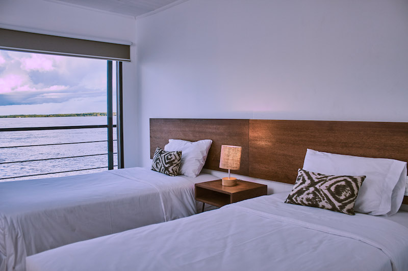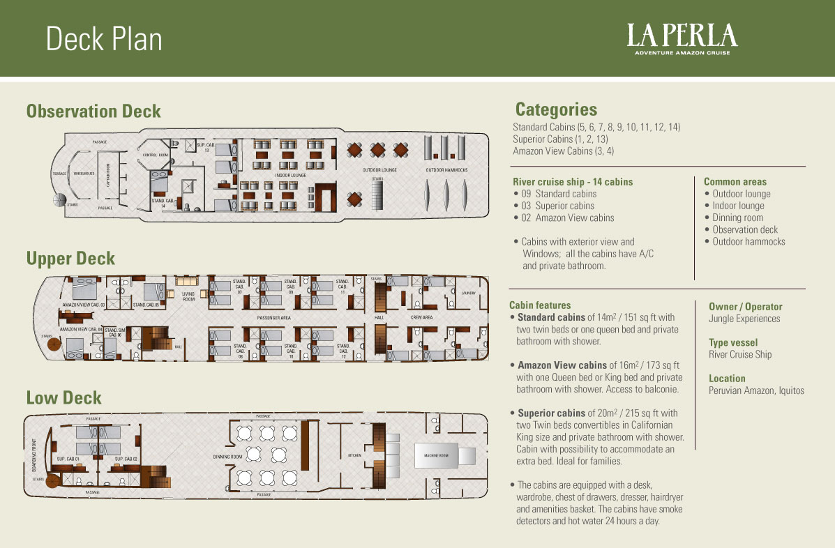 Shared cabins and suites are all double occupancy with private bathroom, air conditioning and view of the river.